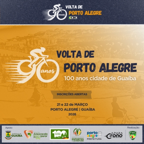 Evento VOLTA DE PORTO ALEGRE 90 ANOS – 100 ANOS CIDADE DE GUAÍBA – ESTRADA 2026 A Volta de Porto Alegre é uma prova de ciclismo de estrada, 3ª Etapada do campeonato gaúcho de ciclismo e v álida para Ranking Nacional CBC - UCI nas categorias Elite e Sub23 Masculino e Feminino, que disputarão as três etapas do evento, as demais categorias participarão apenas das etapas de Contrarrelógio Individual e Circuito, no dia 22, em Guaíba. Serão 3 Etapas - Estrada, Contra Relógio e Circuito PROGRAMAÇÃO DIA 1 — 21 de Março ETAPA DE ESTRADA — Porto Alegre (Somente categorias Elite e Sub23 Masculino e Feminino)07:30 – Abertura da secretaria e assinatura de súmula (Estrada) 08:30 – Largada controlada da prova de Estrada 13:00 – Previsão de encerramento da Etapa de Estrada DIA 2 — 22 de Março CONTRARRELÓGIO INDIVIDUAL + CIRCUITO — Guaíba (Todas as categorias) Contrarrelógio Individual (CRI) 06:00 – Abertura da secretaria e assinatura de súmula (CRI e Circuito) 06:45 – Briefing técnico do CRI 07:30 – Primeira largada do CRI 12:30 – Previsão de encerramento do CRICircuito 14:00 – Briefing técnico do Circuito 15:00 – Largada do Circuito 19:00 – Previsão de encerramento do Circuito 19:30 – Cerimônia de premiação final Locais do Evento